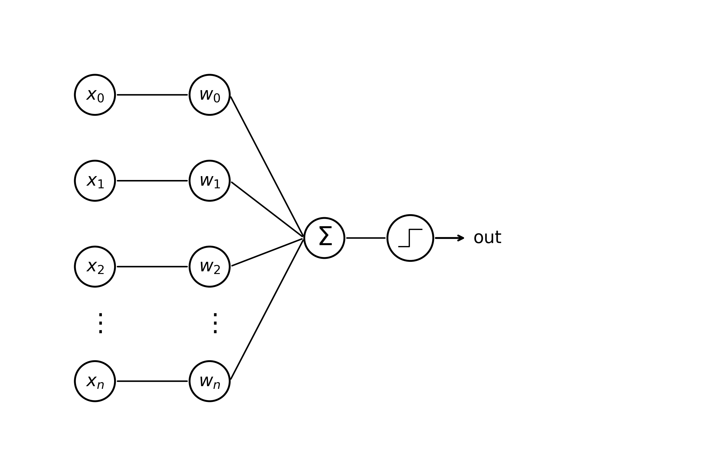 \[y = \begin{cases} +1 & \sum_{i=1}^{n} w_i x_i + b \geq 0 \\ -1 & \text{otherwise} \end{cases} \text{.}\]Or, using matrix multiplication instead of a weighted sum: