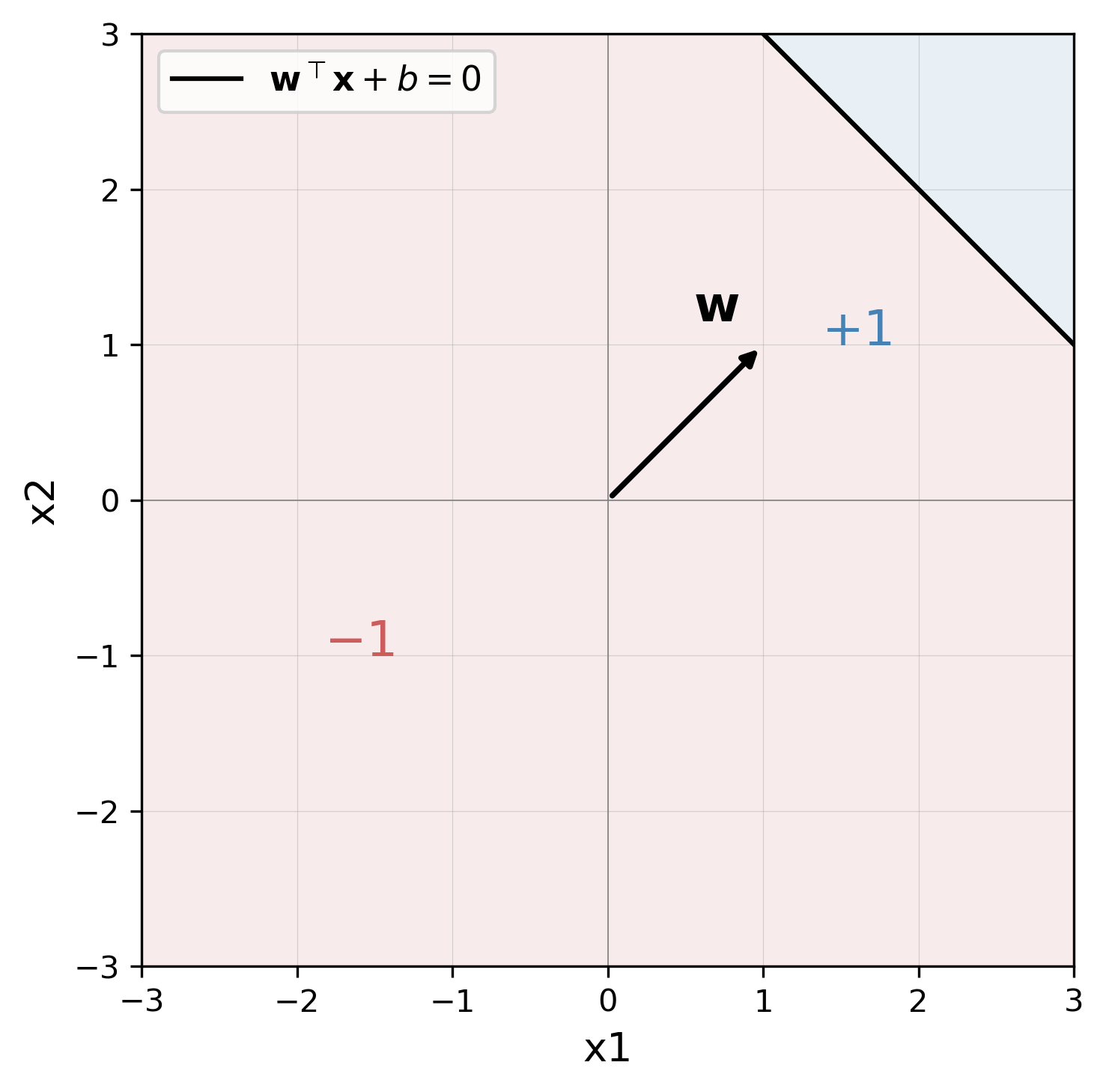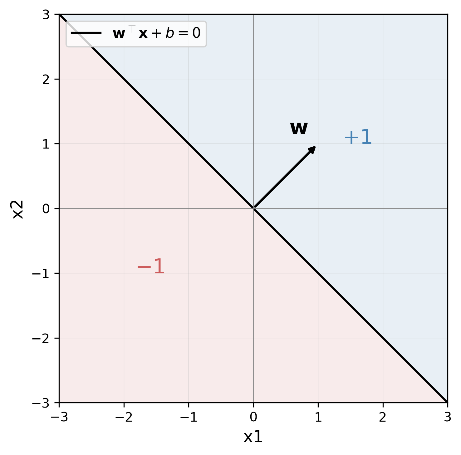 Weight edges connecting \(x_i\) –> \(w_i\) denote multiplication, edges from \(w_i\) –> \(\sum\) summation, and from \(\sum\) –> (activation fn) thresholding. This machinery constitutes a single “neuron” of a neural network consisting of (1) incoming weights, (2) a bias term, and (3) a non-linear activation function. We can think of the equation above as characterizing a hyperplane with dimensionality \(\mathbb{R}^{d - 1}\), capable of splitting any space in two. Points \(\mathbf{x}\) that lie in \(\mathbb{R}^{d}\) are classified as either \(-1\) or \(+1\) by our perceptron model. To make things more concrete, we’ll start off by showing the reader an example in \(\mathbb{R}^{2}\) for a weight vector \(\mathbf{w} = [1, 1]\) and bias term \(b=0\).
