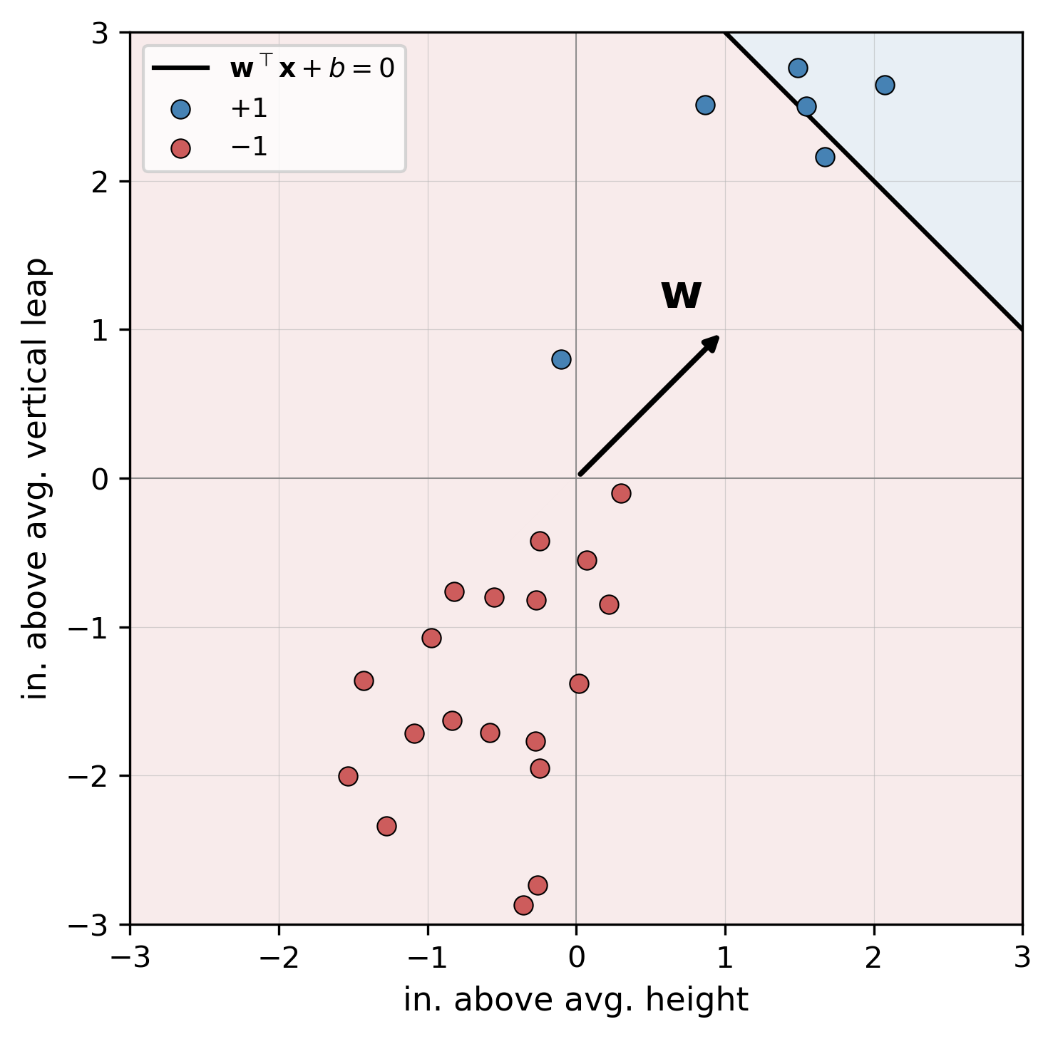Consider a dataset of basketball players \(\mathcal{D} = \{ (\mathbf{x}_i, y_i) \}_{i=1 \dots n}\), still in \(\mathbb{R}^2\), where \(\mathbf{x}_i = [\text{in. above avg. height}, \text{in. above avg. vertical leap}]\), and \(y_i = +1\) and \(y_i = -1\) indicate that player can or can not dunk, respectively. Reusing our perceptron model from earlier, our dataset might look like so: