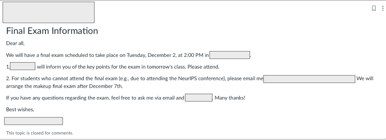- 4. Confirm we have no end-of-semester conflicts; post proof of completion
